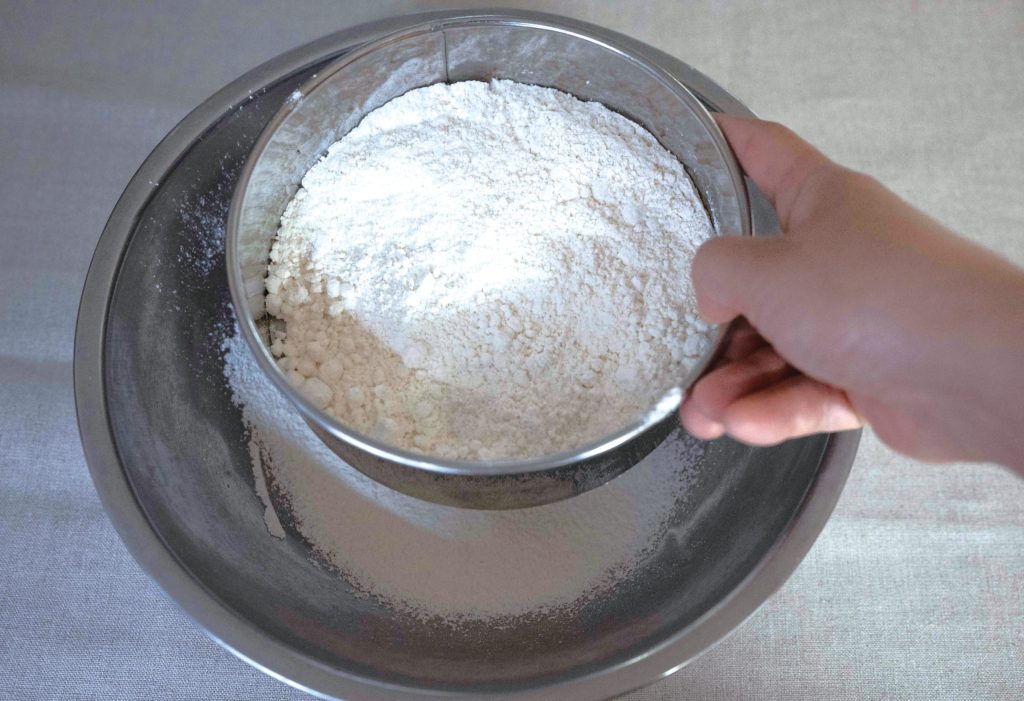 ① パウンド型に紙を敷く。薄力粉、ベーキングパウダー、シナモンを合わせふるう。