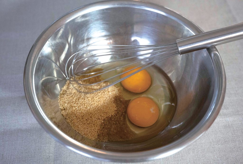 ②ボウルに卵と砂糖を入れ泡立て器で混ぜる。
