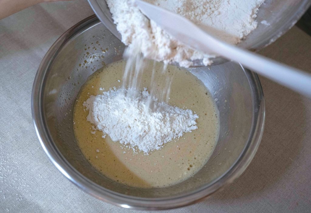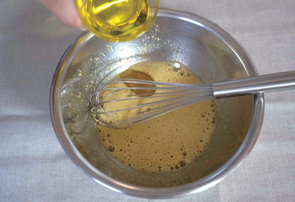 ③ ②に菜種油を混ぜ、牛乳を混ぜる。
