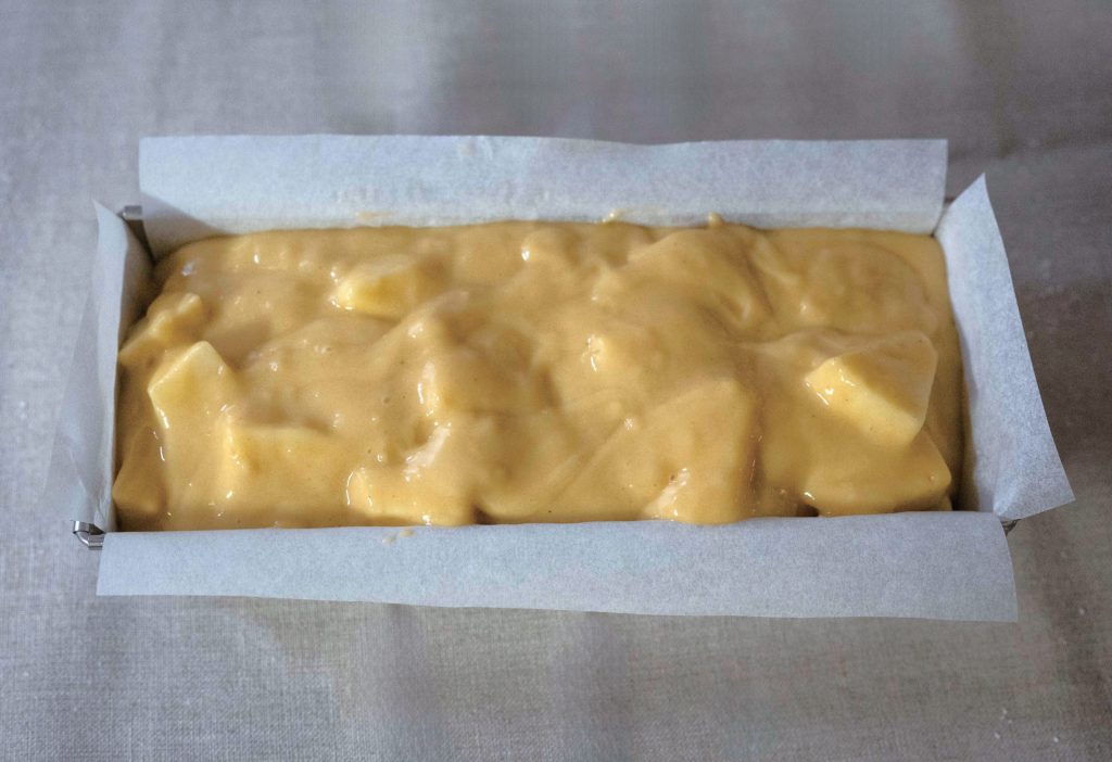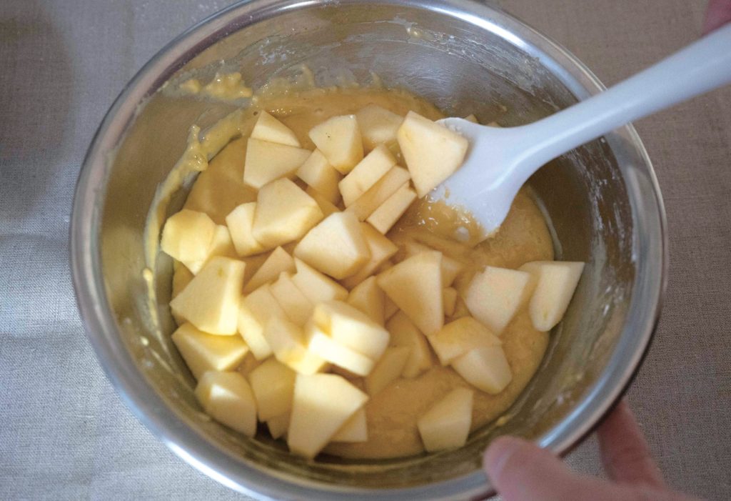 ⑤ りんごは八つ切りにしてからいちょう切りにする。④にりんごを入れヘラで混ぜる。